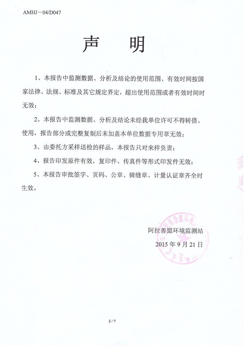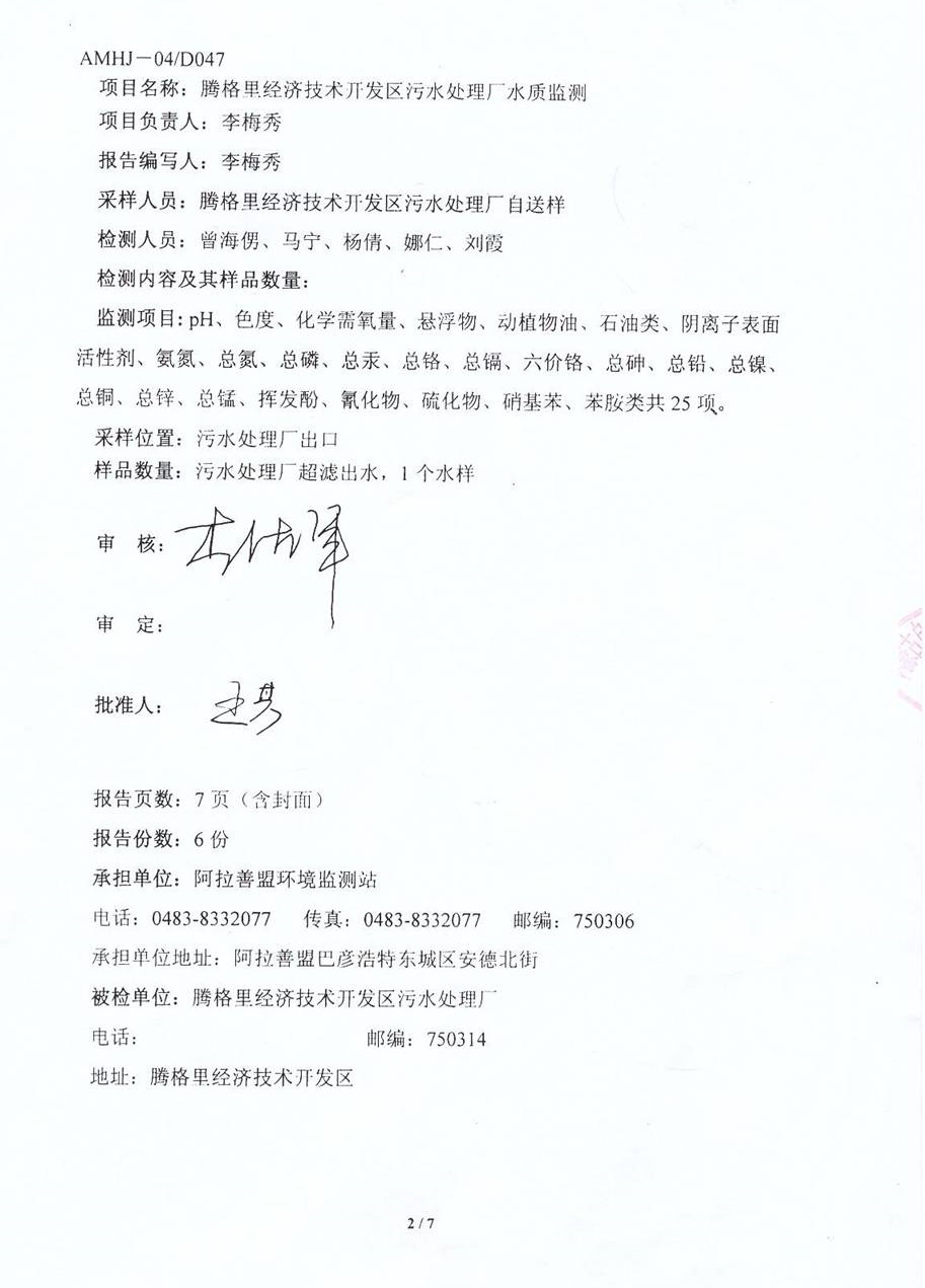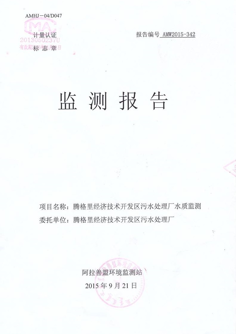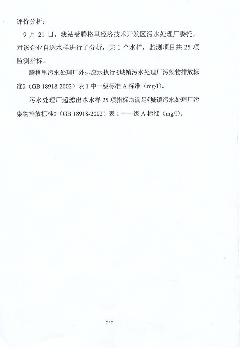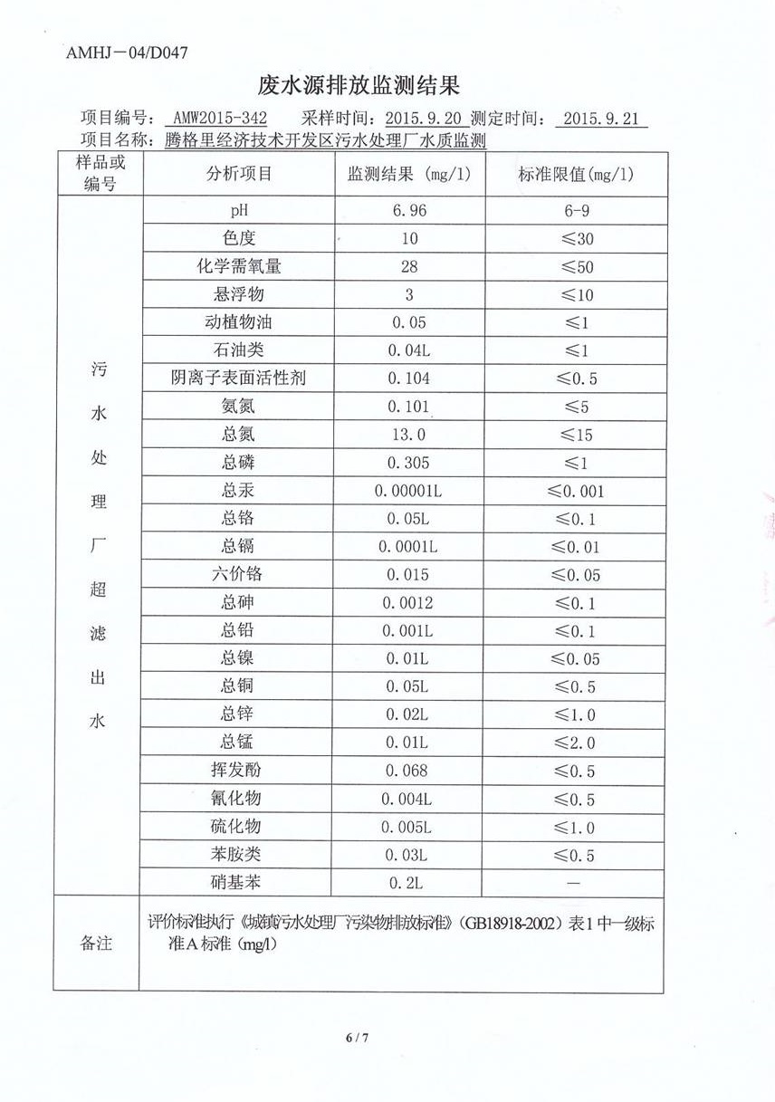 2015年9月21日,受騰格里經濟技術開發(fā)區(qū)污水處理廠委托,阿拉善盟環(huán)境監(jiān)測站對園區(qū)內水廠出水水樣進行分析,出具水質監(jiān)測報告,報告顯示,騰格里污水處理廠外排廢水執(zhí)行《城鎮(zhèn)污水處理廠污染物排放標準》(GB18918-2002)表1中一級標準A標準(mg/l)。污水處理廠超濾出水水樣25項指標均滿足《城鎮(zhèn)污水處理廠污染物排放標準》(GB18918-2002)表1中一級標準A標準(mg/l)。